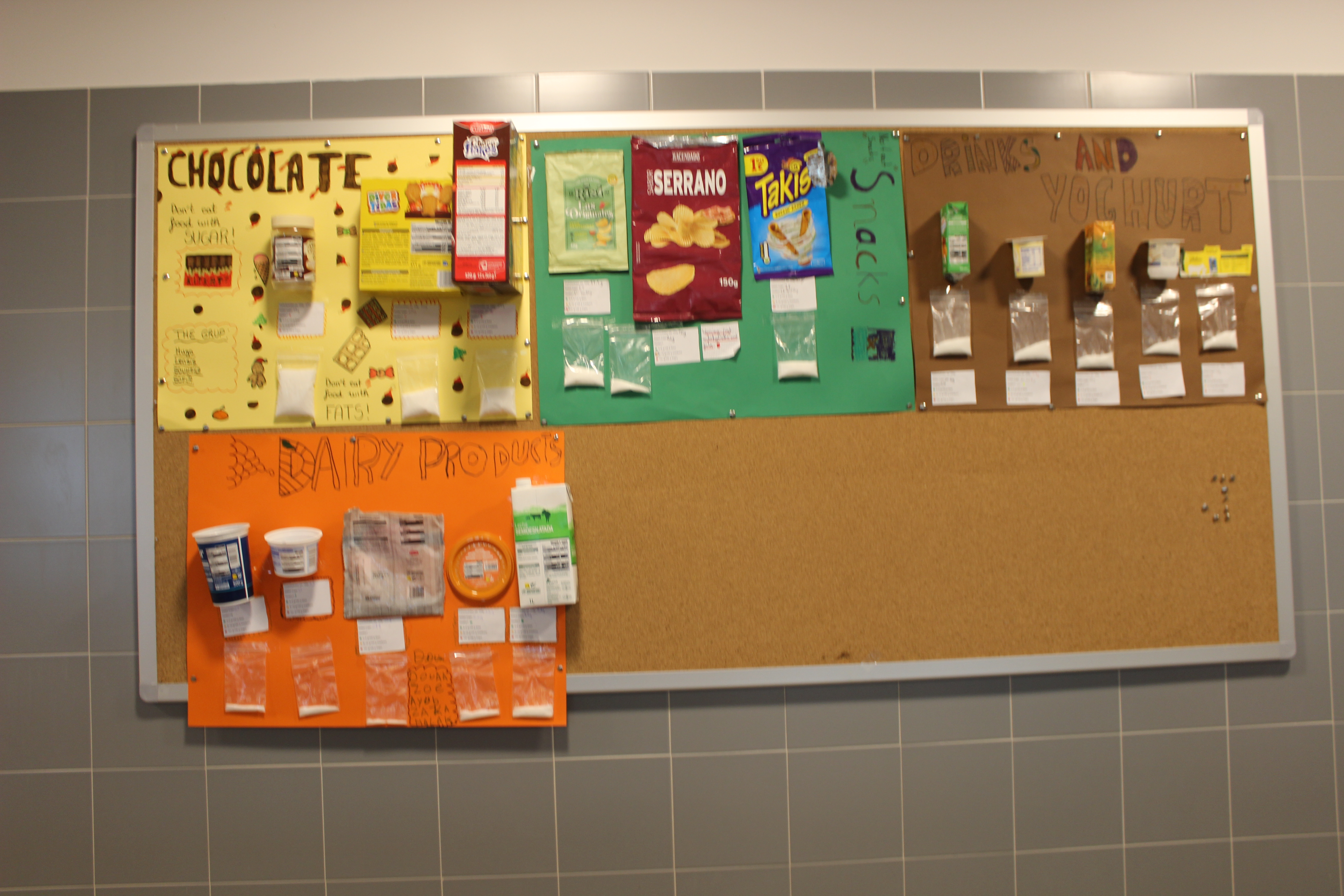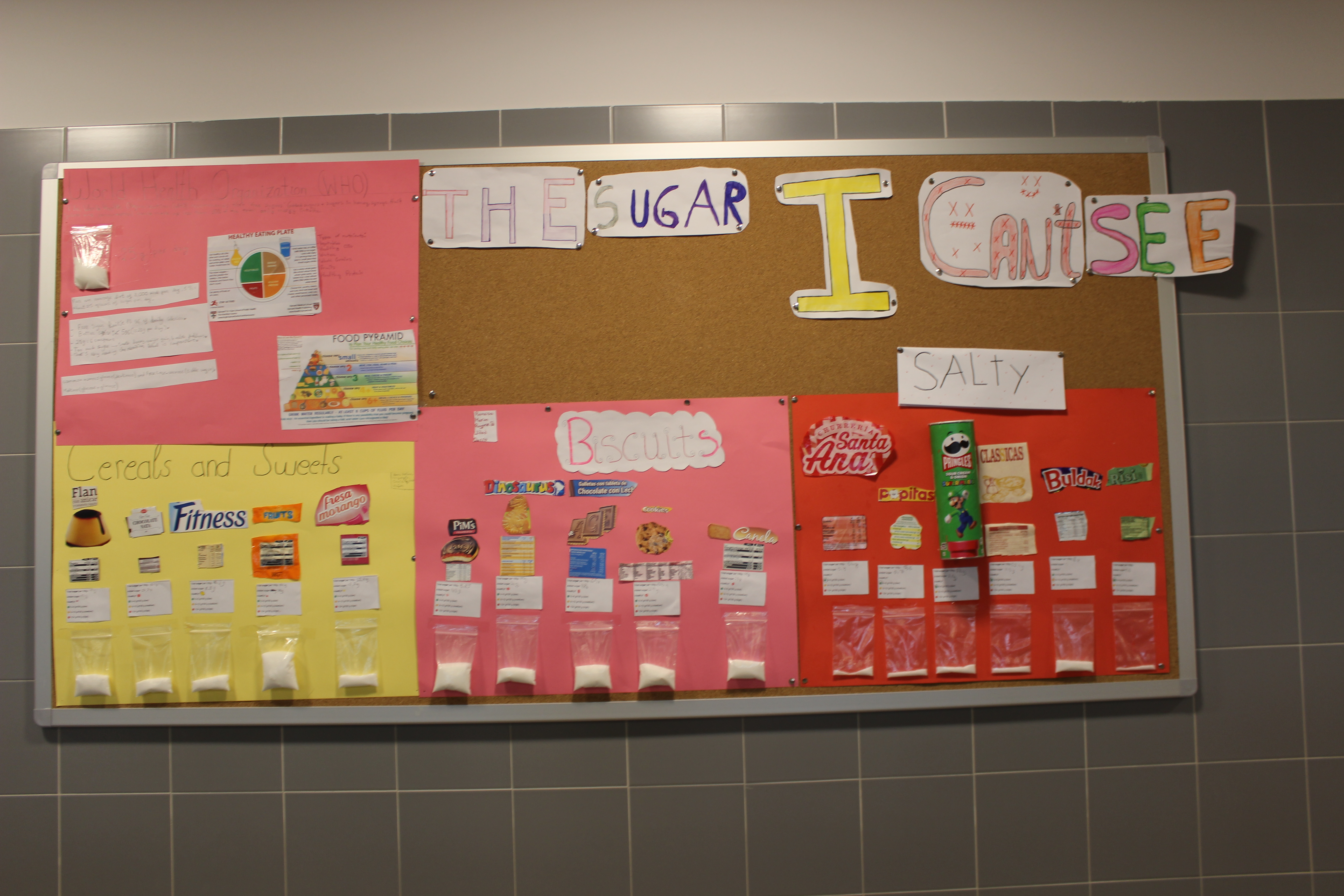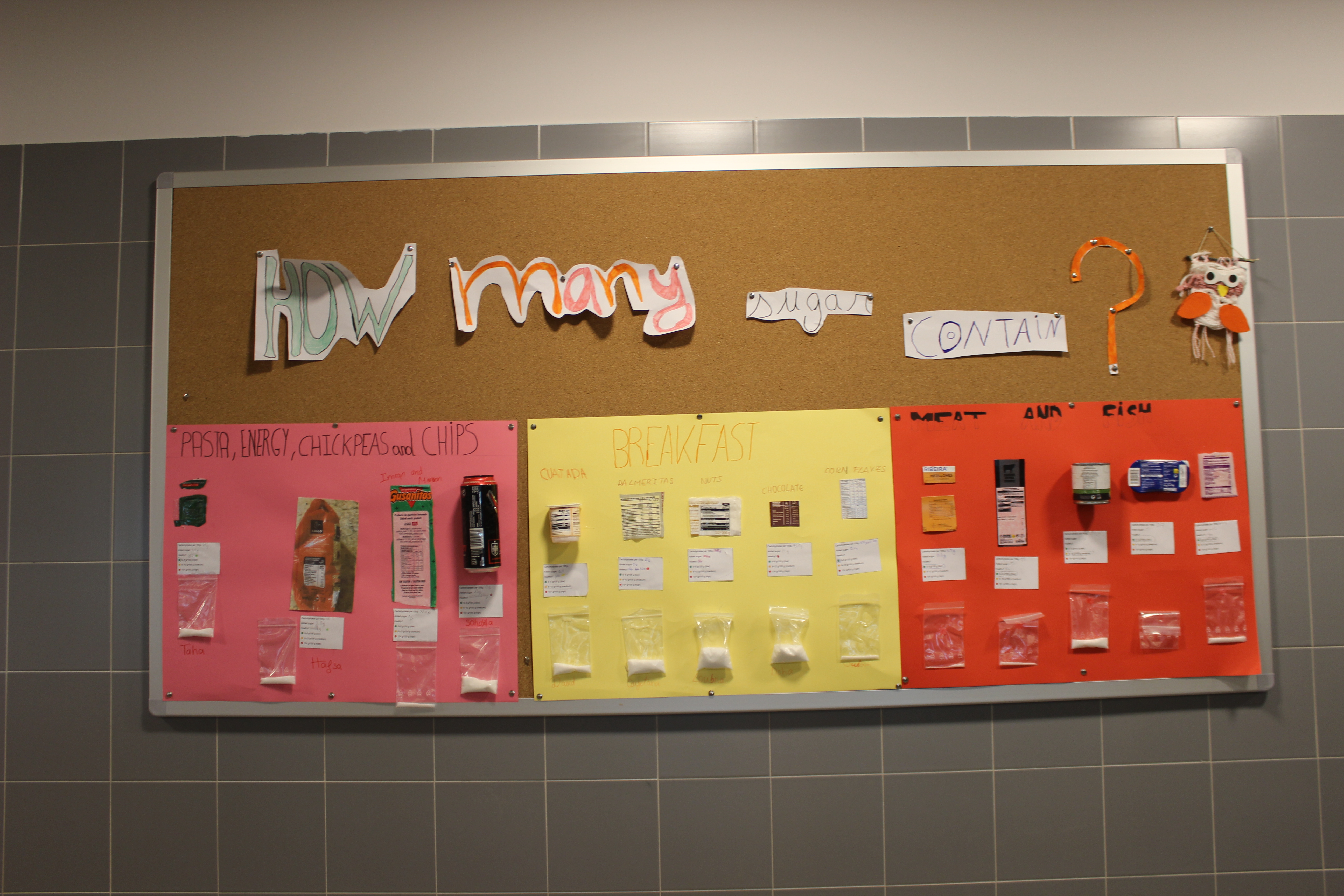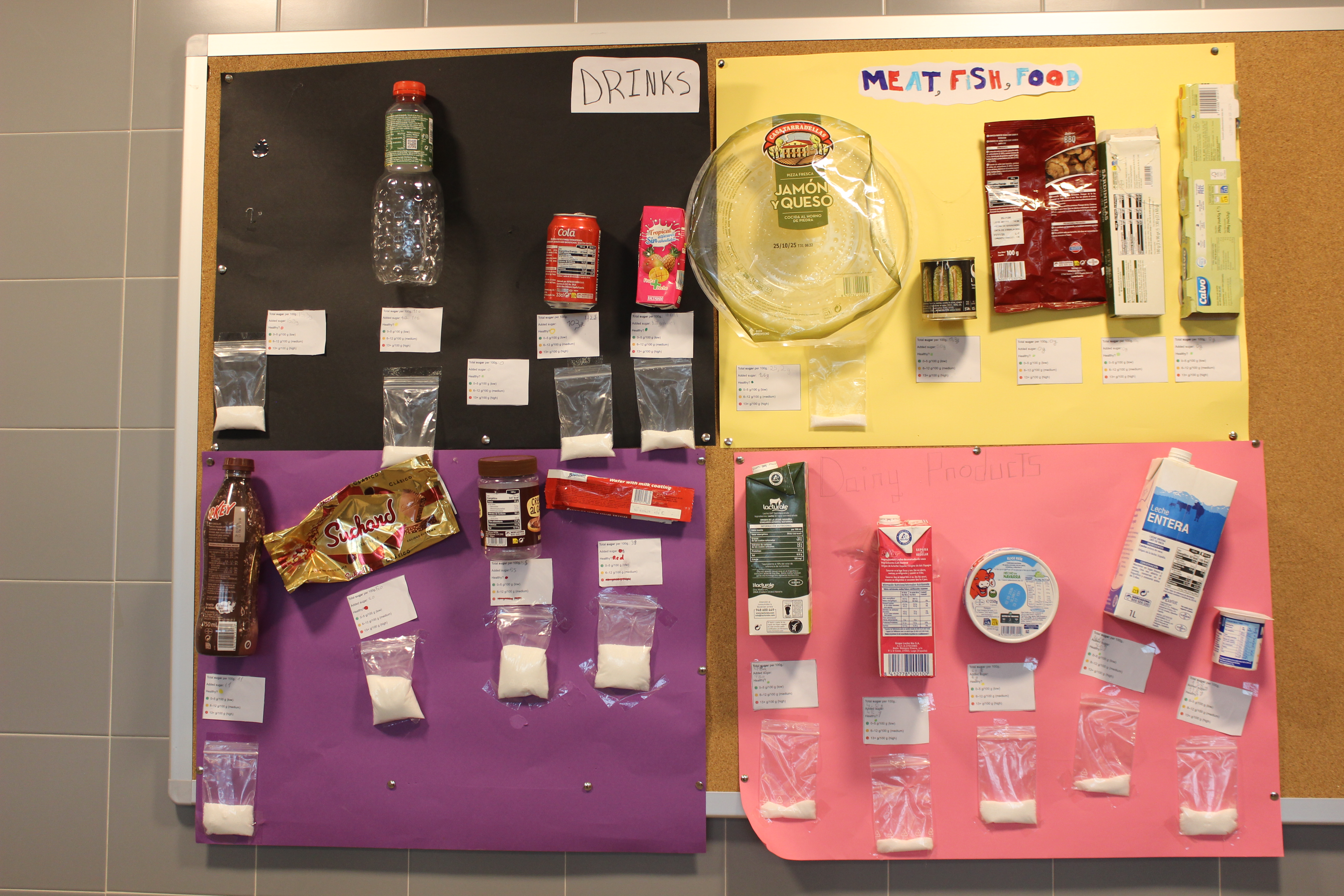 Como resultado final, se han elaborado murales visuales y muy llamativos, en los que se han expuesto las cajas o envases de los productos analizados, acompañados de sobres que contienen la cantidad real de azúcar presente en cada uno de ellos. De este modo, el alumnado ha podido comprobar de forma tangible y directa cuánto azúcar se esconde en productos que, en ocasiones, percibimos como inofensivos.
